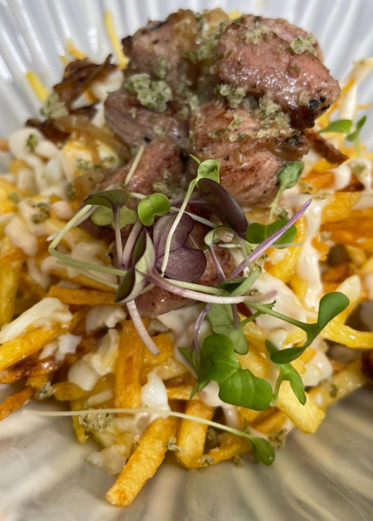 Séptima 📸-. Huevos rotos con presa ibérica y trufa.