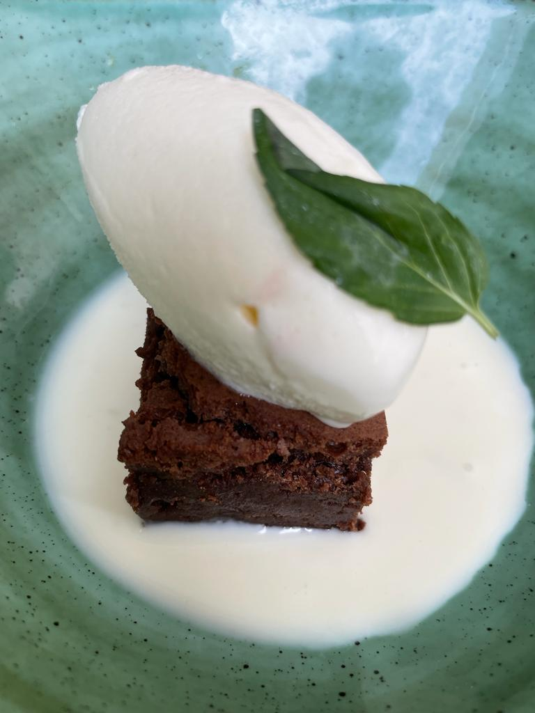 Octava 📸-. Brownie con sopa de chocolate blanco y helado de plátano.