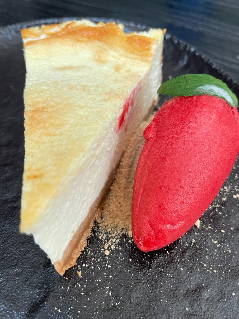 Novena 📸-. Tarta de queso payoyo y queso azul acompañada de helado de fresa (7€). ⚠️Entre las mejores que hemos probado.