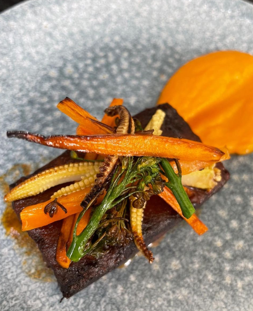 Primera 📸-. Cordero a baja temperatura glaseado con su propio jugo, puré de boniato y verduras (16,5€).
