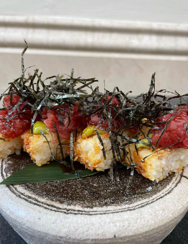 Primera📸-.Nigiri de arroz crujiente con atún, aguacate y alga(13€/4 uds).