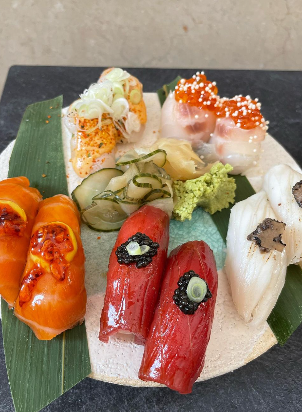 Segunda📸-.Salmon flambeado con ají amarillo (7€/2uds);Atún y caviar (13€/2uds);Pez mantequilla y trufa (5€/2uds);Lubina con huevas(7€/2uds); vieira con mayonesa kimchi y cebolleta(9€/2uds).