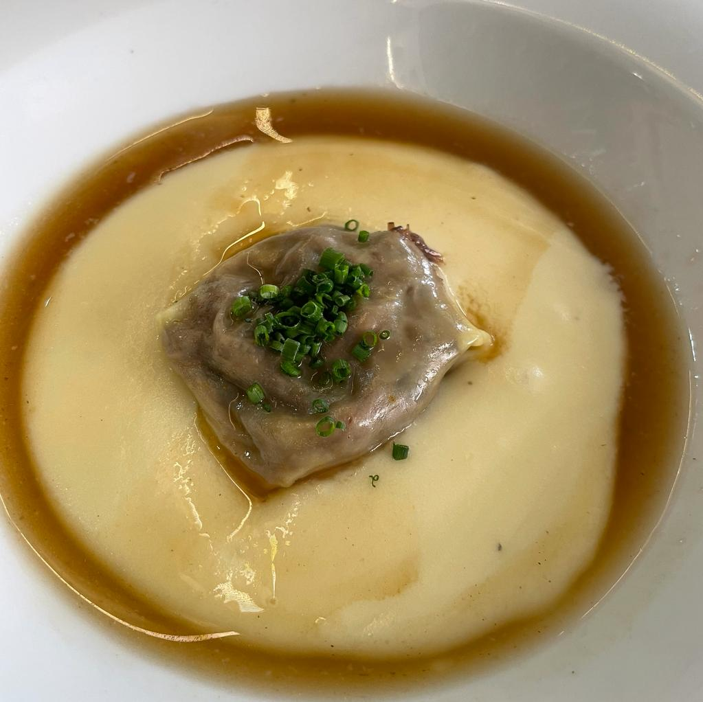 Primera 📸-. Ravioli de rabo de toro sobre cremoso puré de patata y su jugo (9,00€).
