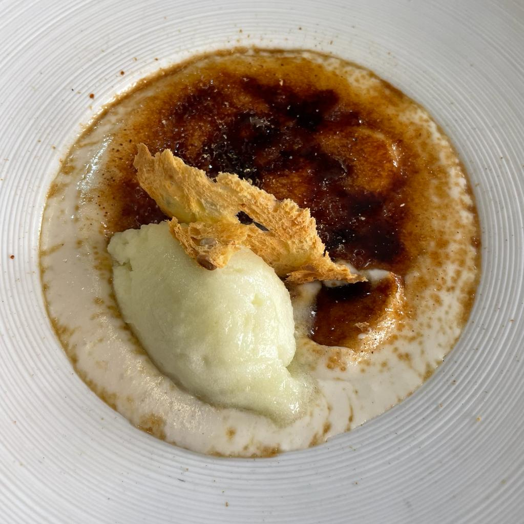 Segunda 📸-. Mazamorra de queso de cabra caramelizada y acompañada de sorbete de manzana verde (12,00€).