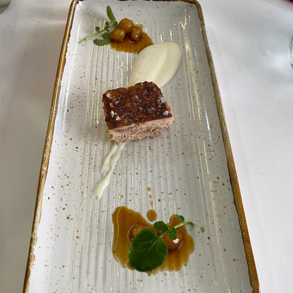 Tercera 📸-. Cochinillo confitado con su piel crujiente, alioli de manzana y cebollitas caramelizadas (18,50€).