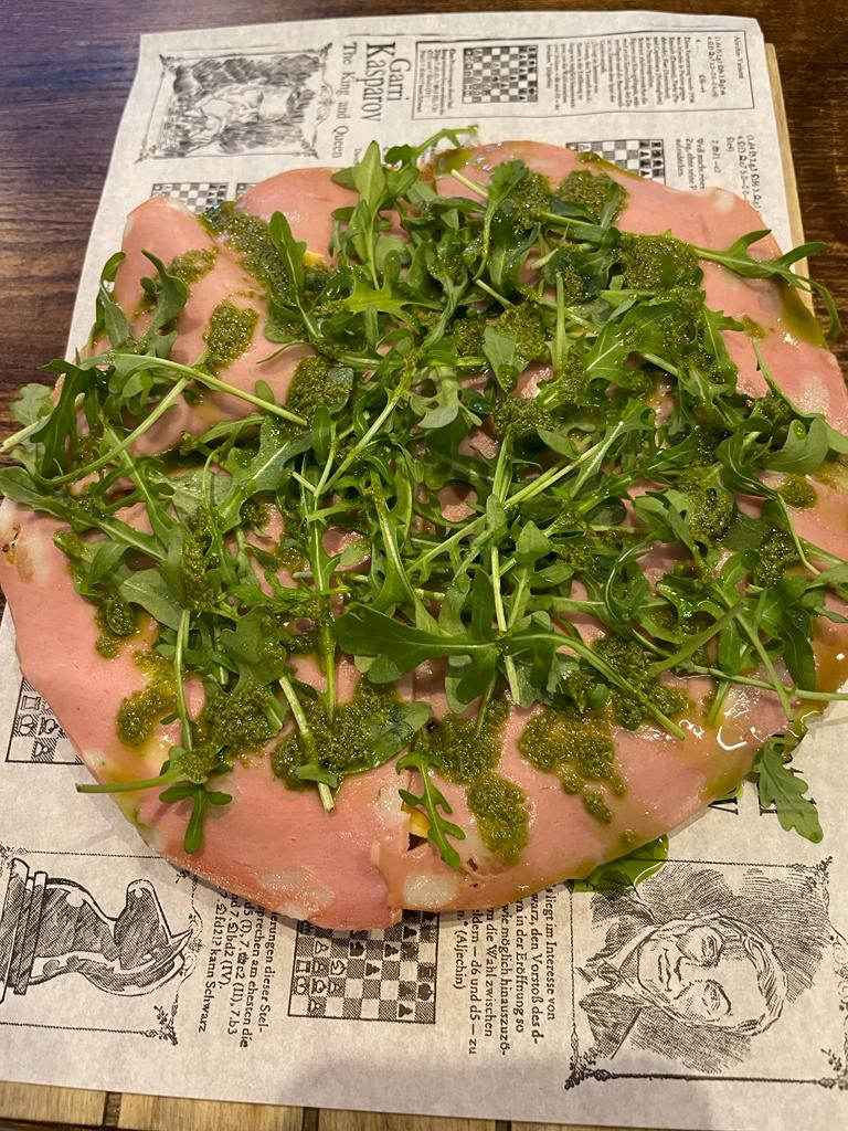 Primera📸-. Pinseta de masa madre, harina de trigo integral con harina de arroz, tomate natural con orégano, mozzarella, burrata Pudiese, rúcula y Mortadella di Bologna (15€).