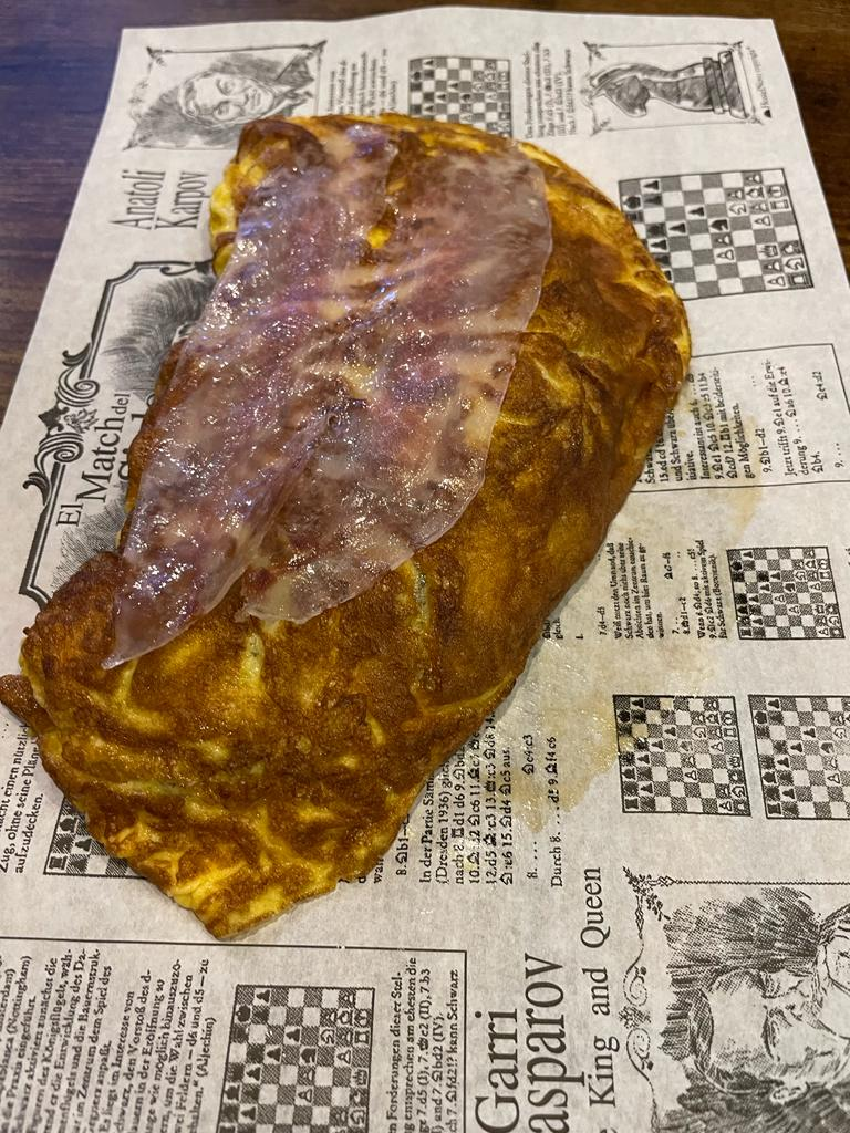Tercera📸-. Tortilla vaga cerrada de 3 huevos sin patata, baja cocción con rabo de toro, piparra y papada Cal Rovira (12€).