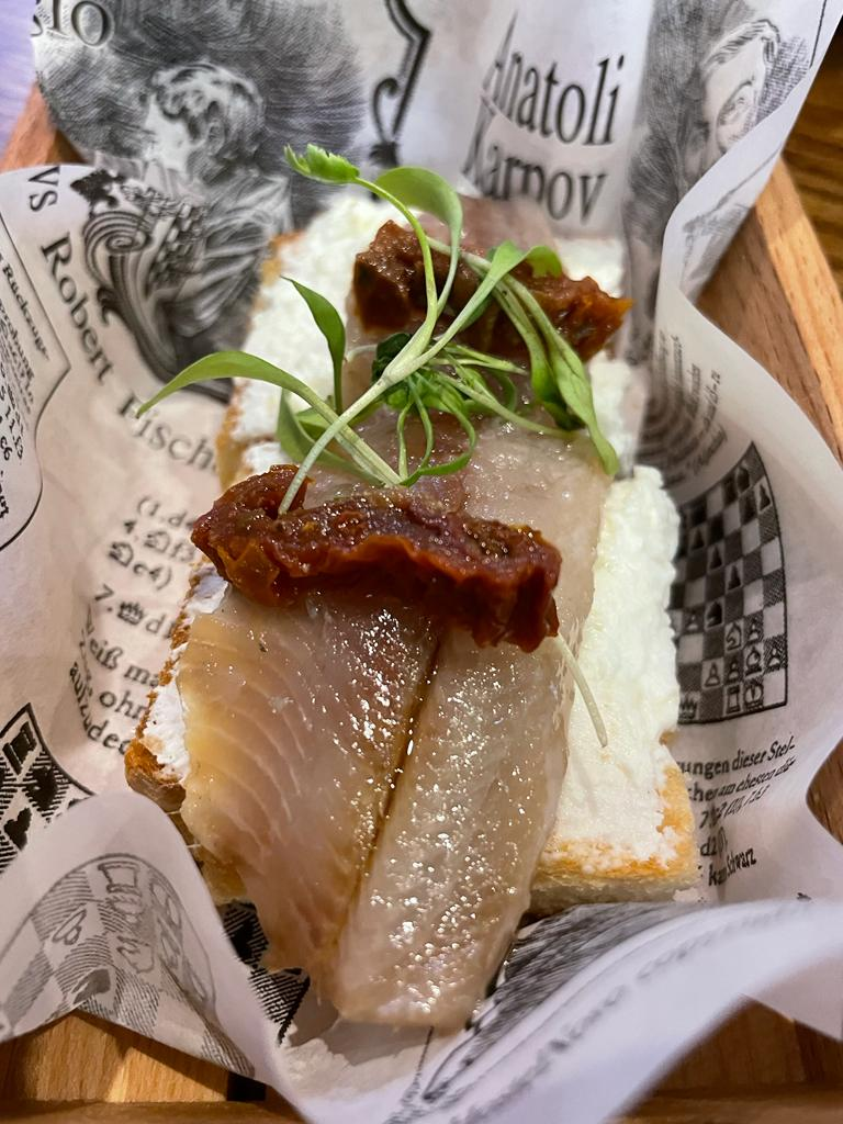 Segunda📸-.Mini-tostada de Sardina Ahumada con “labneh” de oveja de Quesería Calaveruela (en el norte de Córdoba) y tomate seco (7€).