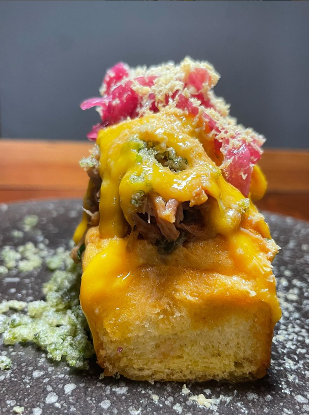 Primera 📸-. Brioche Niku-Yaki con emulsión de wasabi, vinagreta de mango y foie rayado (7€).